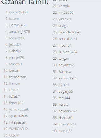 @Esmerezel21 Aynı ithamla daha önce de gelmiştin, o zaman da bilgi verip uyarmıştım. Bu forumda çekilişte konuya adını doğru şekilde yazan herkes çekilişe alınır, sorunu da cevaplayayım çekiliş listesinde vardın evet. Etkinliklere şaibe karıştırma konusunda en son foruma laf söyleyebilecek üyelerden birsin bunu sen de çok iyi biliyorsun, farklı konularda seni özel mesaj yoluyla uyarmıştım kırmamak, incitmemek adına. Ama biraz dikkat edelim yazılan cümlelere.