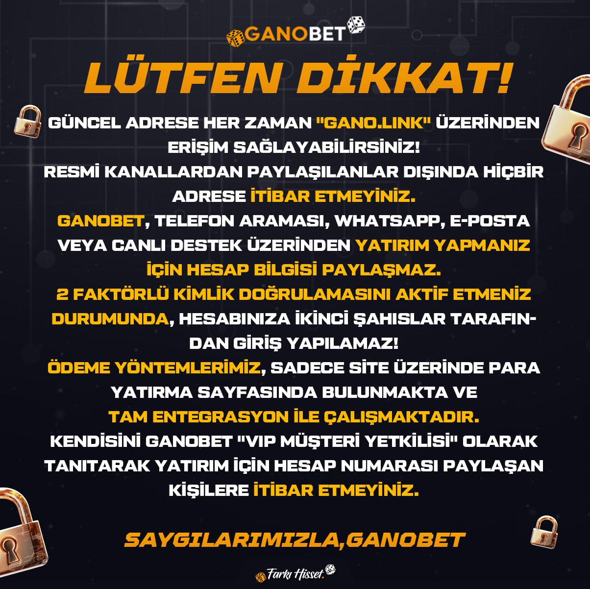 ⚠️Unutmayın hiçbir Ganobet çalışanı sizden Whatsapp üzerinden kullanıcı adı, şifre, hesap giriş bilgileriniz vb. bilgiler talep etmez.